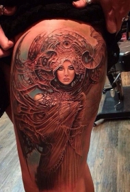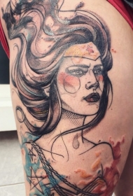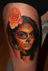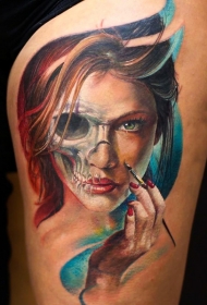 大腿彩色的神秘女人与骷髅结合纹身图案