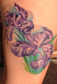 女生大腿美丽的彩色骷髅与紫色花朵纹身图案