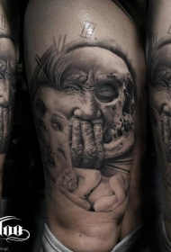 大腿灰色的时钟和骷髅婴儿女人肖像纹身图案