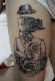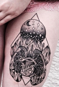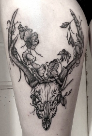 大腿花卉鹿头骨雕刻风格黑色纹身图案