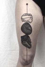 大腿黑色水雕刻风格马骨架与树叶纹身图案