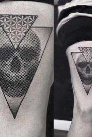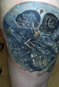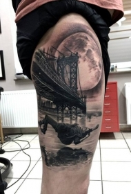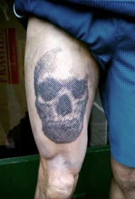 大腿黑灰风格十字架上耶稣头骨和面具纹身图案