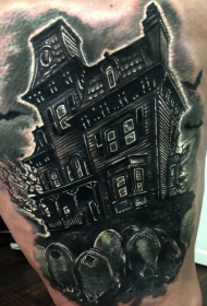 大腿令人毛骨悚然的黑暗房子和墓地纹身图案