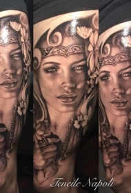 大腿黑灰风格妇女肖像与鲜花纹身图案
