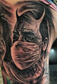 大腿雕刻风格黑色半头骨半猴子头部纹身图案