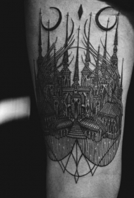 大腿黑色线条雕刻风格幻想大教堂纹身图案