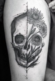 大腿雕刻风格黑色骷髅与花朵纹身图案