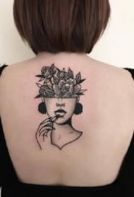 美背纹身:女生后背上唯美的黑灰点刺梵花纹身