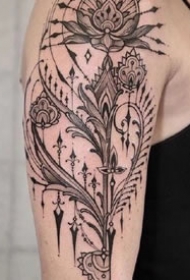 手臂上的点刺风格曼陀罗梵花纹身图案