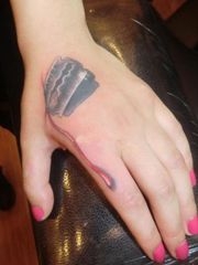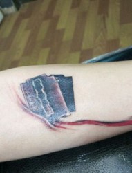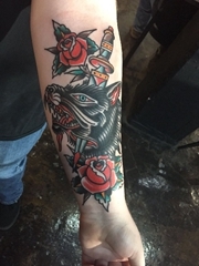 手臂上传统纹身玫瑰花匕首刺穿滴血狼头纹身图片