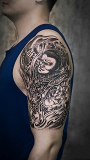 男性右手大臂膀上帅气的黑灰色斗战胜佛纹身图片