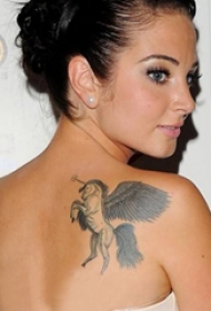 明星纹身 明星后背上黑灰色的独角兽纹身图片