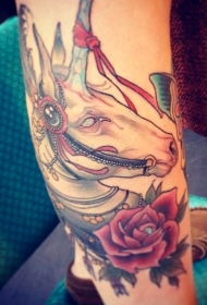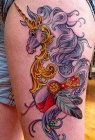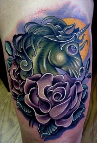 大腿漂亮的五彩独角兽和玫瑰纹身图案