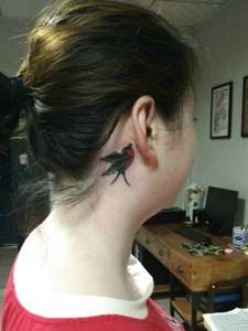 漂亮妹子耳后根处黑色的金鱼和花朵纹身