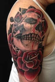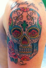 肩部彩色骷髅头与玫瑰花纹身图案