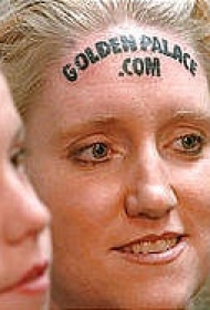 女性额头上的英文字母广告纹身