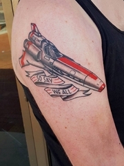 男子右手大臂上漂亮的太空堡垒飞船纹身图片