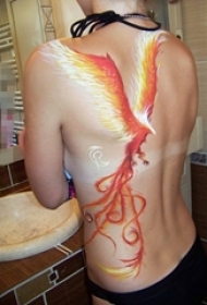 男生背部彩绘红白展翅凤凰纹身图片