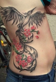 黑色凤凰和红色花朵侧肋纹身图案