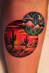 男生手臂上彩绘渐变简单线条植物仙人掌和沙漠风景纹身图片