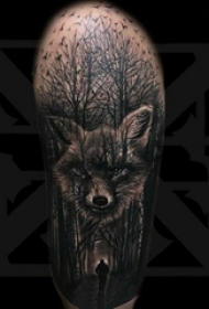 男生大臂上黑色点刺简单线条小动物狼轮廓风景纹身图片