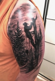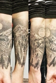 男生手臂上黑灰素描点刺技巧唯美风景纹身图片