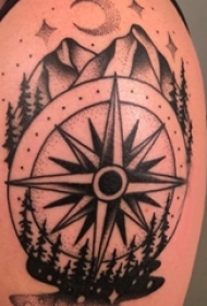 男生手臂上黑色点刺几何三角形山水风景纹身图片