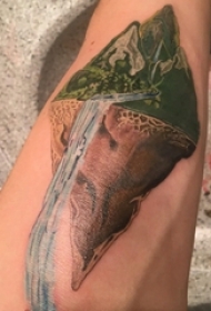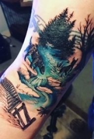 男生手臂上彩绘水彩素描文艺唯美风景纹身图片