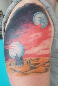 男生手臂上黑灰素描点刺技巧创意唯美风景纹身图片