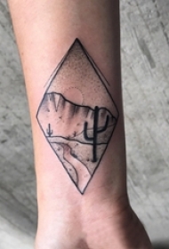 男生手腕上黑色点刺几何简单线条创意风景纹身图片