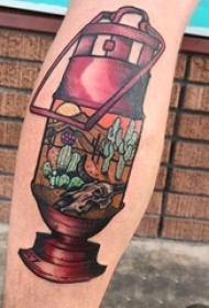 男生小腿上彩绘水彩素描创意煤油灯抽象风景纹身图片