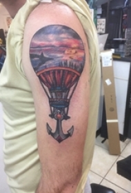 男生手臂上彩绘渐变简单线条热气球和风景纹身图片