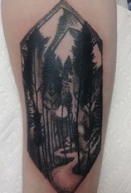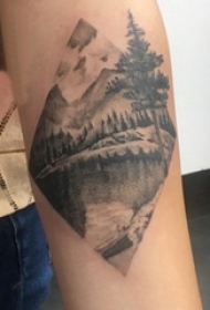 女生小腿上黑灰点刺几何简单线条大树森林风景纹身图片