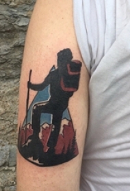 男生手臂上彩绘水彩素描创意登山风景纹身图片