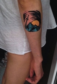 男生手臂上黑色点刺几何简单线条椰树和建筑风景纹身图片