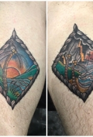 男生小腿上彩绘水彩素描创意文艺风景纹身图片