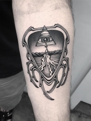 男生手臂上黑灰色几何线条星座与风景纹身图片