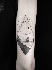 女生手臂上黑色线条几何元素三角形彩绘海边风景纹身图片