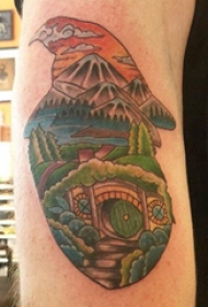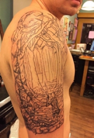 大臂纹身图 男生大臂上花朵和风景纹身图片