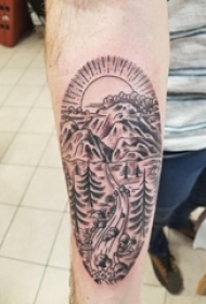 纹身风景 男生手臂上黑灰的风景纹身图片