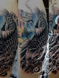 手臂3D逼真的黑色鱼与枫叶纹身图案