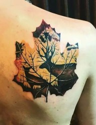 大腿3D五彩的枫叶与鹿和太阳纹身图案
