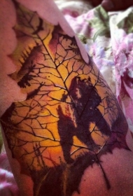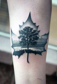 很棒的枫叶轮廓与孤独的树手臂纹身图案