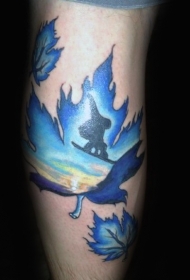 小腿滑雪板色和蓝色的枫叶纹身图案