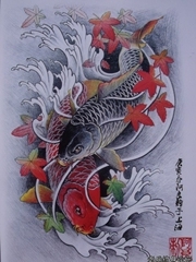 传统日式鲤鱼枫叶浪花纹身图案手稿