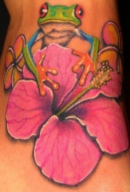 脚背粉红色的芙蓉花与青蛙纹身图案