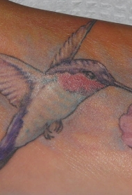 脚背彩色逼真的蜂鸟与花朵纹身图片