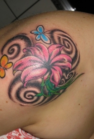 肩部在粉红色的百合花上瓢虫纹身图案