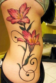 女性腰侧粉红百合花纹身图案