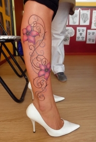 女性腿部粉红花朵藤蔓纹身图案